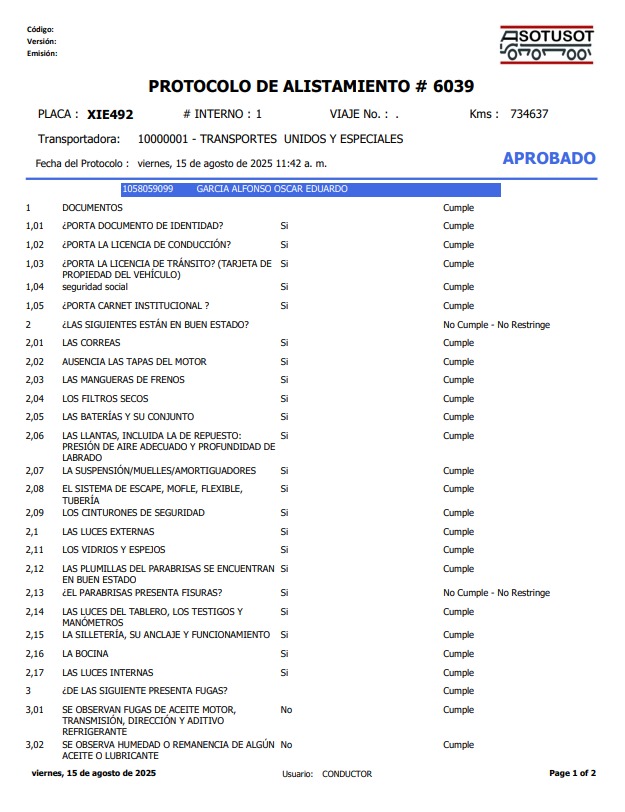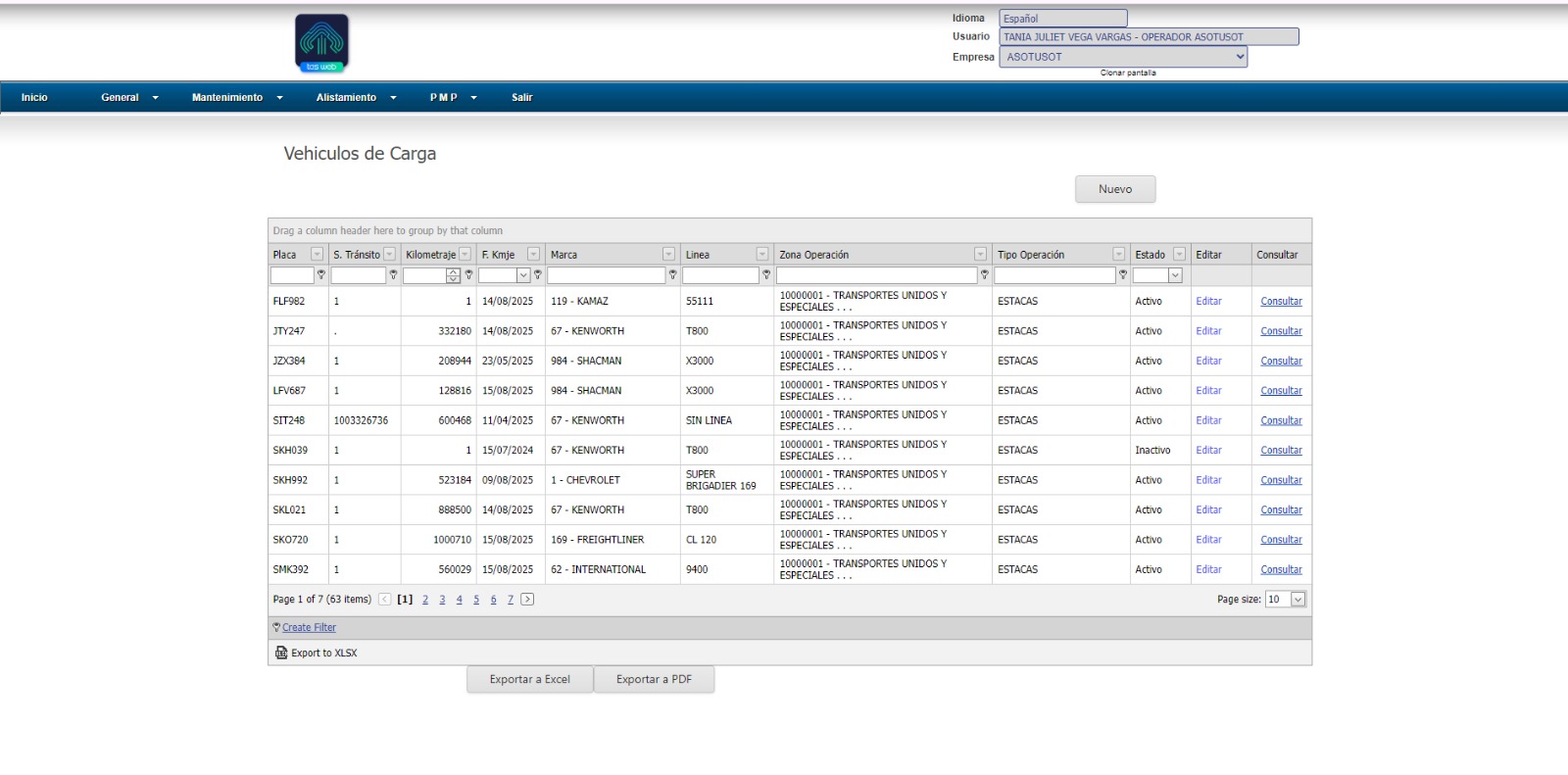 En su objetivo de optimizar continuamente los procesos internos y externos, ASOTUSOT ha invertido en herramientas tecnológicas y talento profesional especializado, con el fin de facilitar la gestión operativa y documental de su flota vehicular. Una de las principales implementaciones ha sido el software TAS, que permite un seguimiento detallado del programa de mantenimiento de cada vehículo. Esta herramienta apoya tanto en los mantenimientos correctivos como preventivos, así como en la realización de inspecciones preoperacionales. Adicionalmente, TAS permite llevar un control riguroso sobre los documentos obligatorios que deben mantenerse vigentes, como el SOAT, la revisión técnico-mecánica, mantenimientos preventivos, revisión King Pin y quinta rueda, y licencias de conducción, entre otros. Con esta inversión, ASOTUSOT reafirma su compromiso con la eficiencia operativa, la seguridad vial y el cumplimiento normativo.